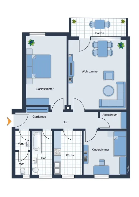 Bitte beachten Sie, dass die gezeigten Bilder eine Beispielmöblierung darstellen. Sie dienen lediglich der Veranschaulichung und können von der tatsächlichen Einrichtung abweichen, entsprechen jedoch der realen Raumgröße.