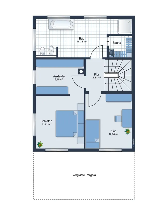 Im Obergeschoss erwarten Sie zwei vielseitig nutzbare Zimmer – ideal als Kinder-, Arbeits- oder Gästezimmer. Das großzügige Hauptschlafzimmer begeistert mit einem separaten Ankleidebereich, während das elegante Badezimmer mit bodengleicher Dusche, Badewanne und edlen Details zum Entspannen einlädt. Ein praktischer Wäscheabwurfschacht führt direkt in den Hauswirtschaftsraum im Untergeschoss, wo bereits Anschlüsse und Platz für eine Sauna vorgesehen sind.