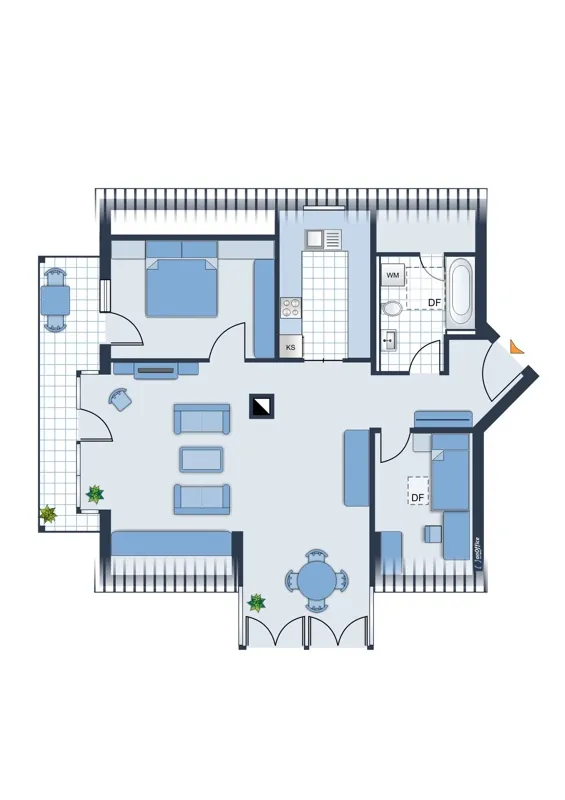 Die Wohnung verfügt über ein großzügiges Schlafzimmer, ein helles Badezimmer und einen offenen Wohn- und Essbereich, der nahtlos in die gut ausgestattete Einbauküche übergeht.